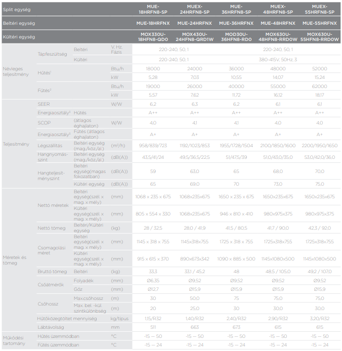 A Midea MUE-36HRFN8-SP parapet-mennyezeti split (R32, 10,6 kW) fontos tulajdonságai: